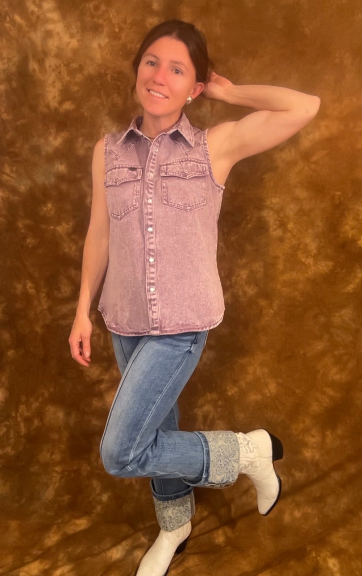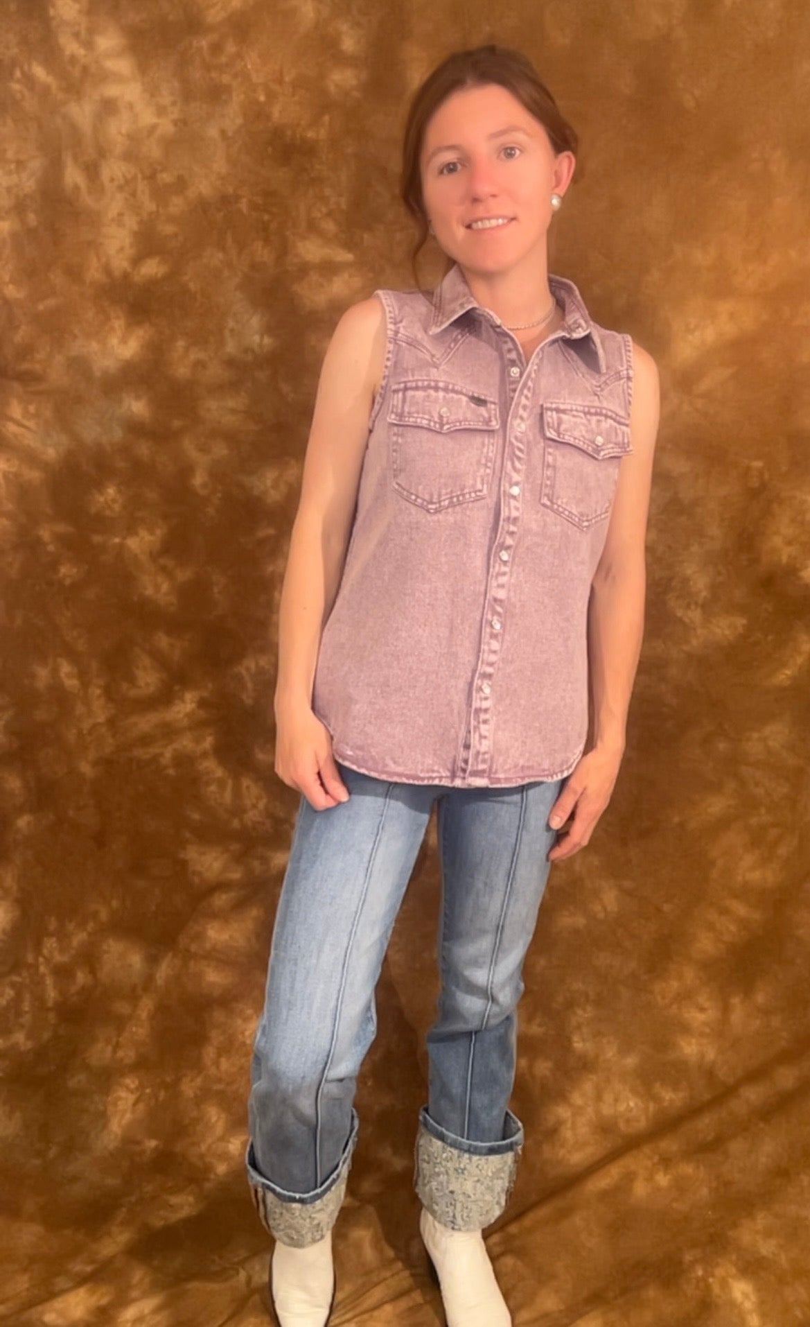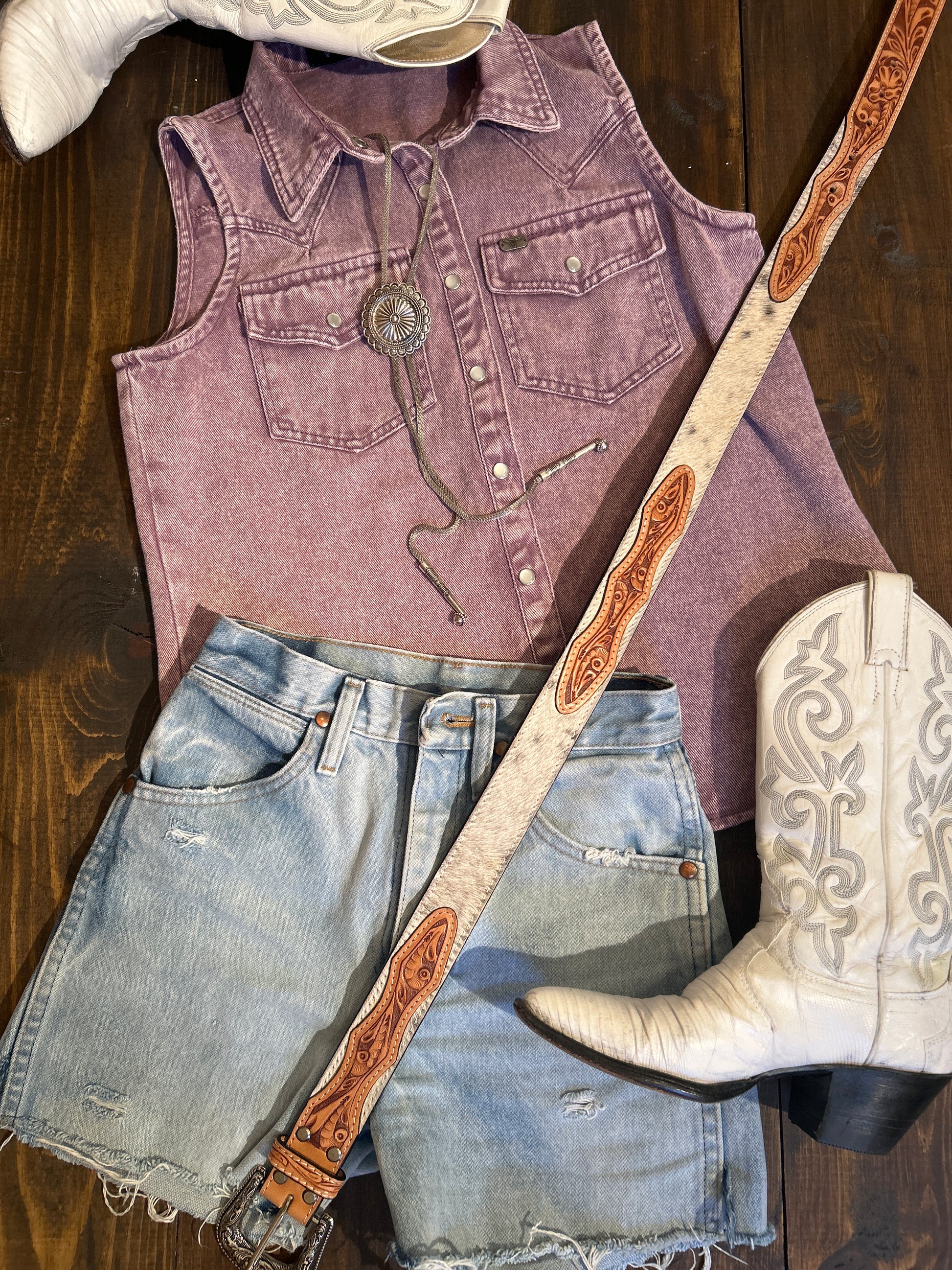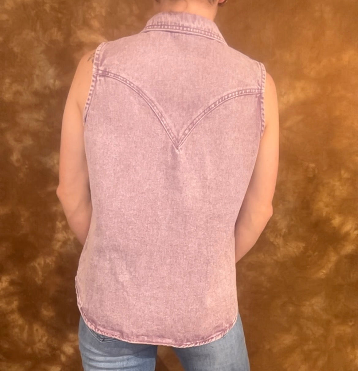 Finished with timeless pearl snaps and a flattering sleeveless cut, itâs the perfect mix of rugged and radiant. Style it with your favorite flares and boots for a full rodeo-ready look, or pair it with cutoffs for those warm, golden-hour hangs.